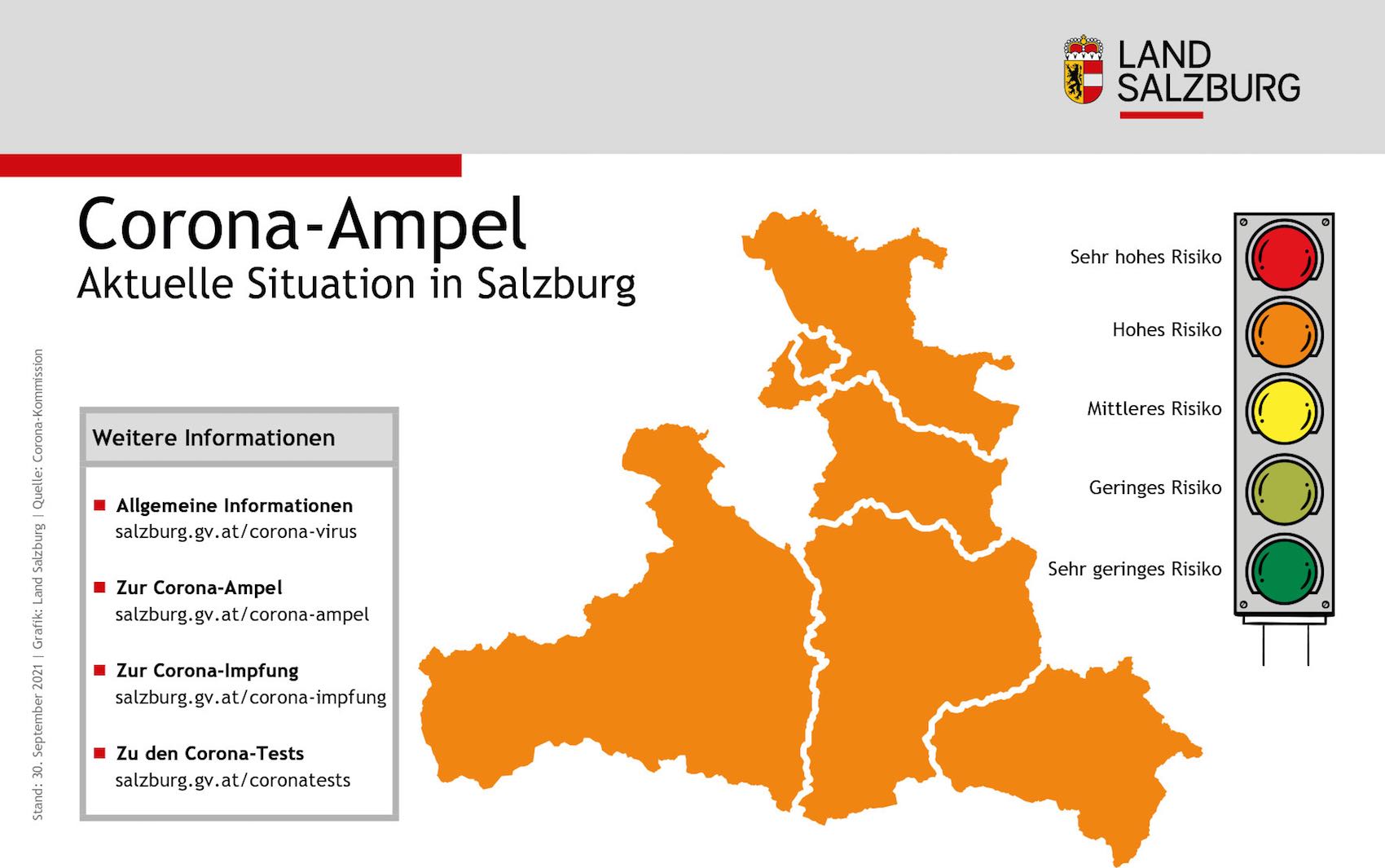 Die Corona-Ampelkommission hat Salzburg aktuell wieder mit „Orange - hohes Risiko“ eingestuft, ebenso bewertet wurden Wien, Niederösterreich, Oberösterreich, Kärnten und Vorarlberg. Mittleres Risiko (Gelb) gibt es in der Steiermark und Tirol, das Burgenland wurde auf geringes Risiko (Gelbgrün) gestellt.
