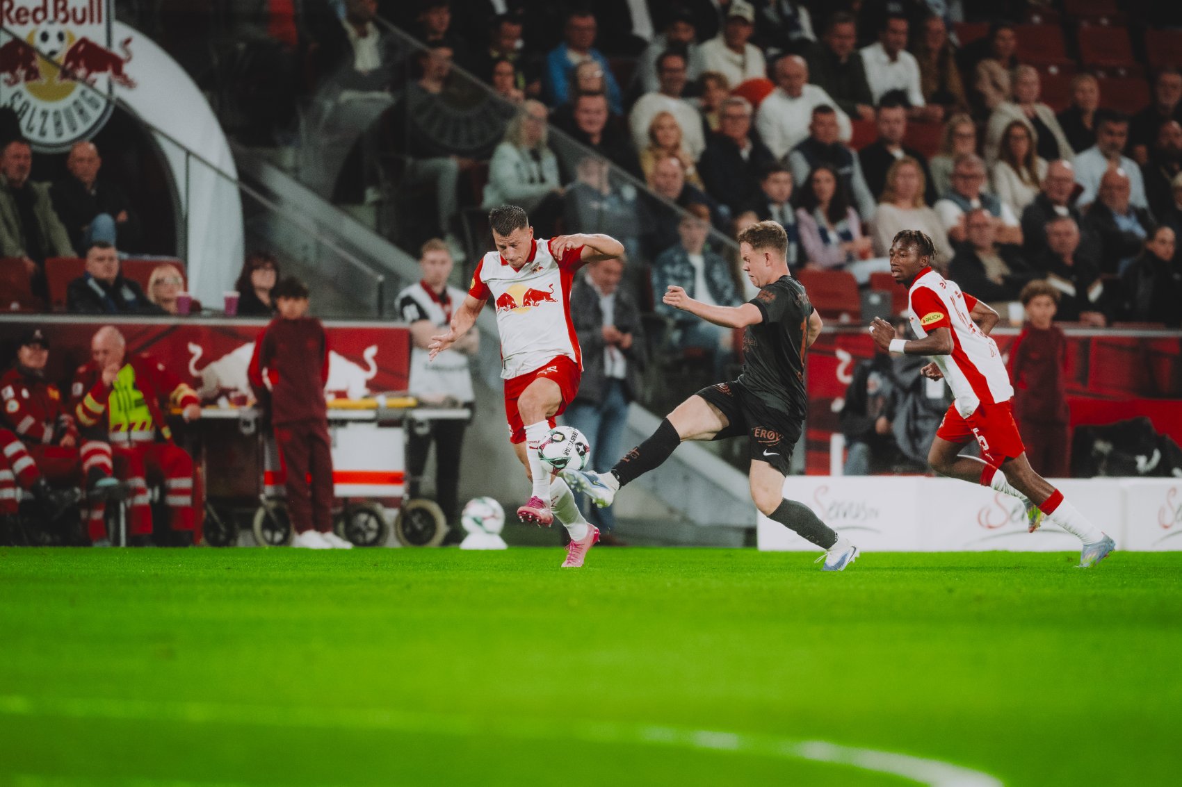 Vor 11.949 Zuschauern gibt es zunächst gleich einmal die sprichwörtlich kalte Dusche für die Hausherren. Da hilft auch das neue Grün in der Red Bull Arena wenig. In der spielfreien Zeit wurde auf einem komplett sanierten Unterbau wieder einmal ein neuer Rasen verlegt. Schon nach drei Minuten gehen die Gäste durch einen Treffer von Emil Kornvig in Führung. Doch Maurits Kjaergaard bringt die Bullen gleich drei Minuten später wieder zurück, indem er via Freistoß zum Ausgleich trifft.