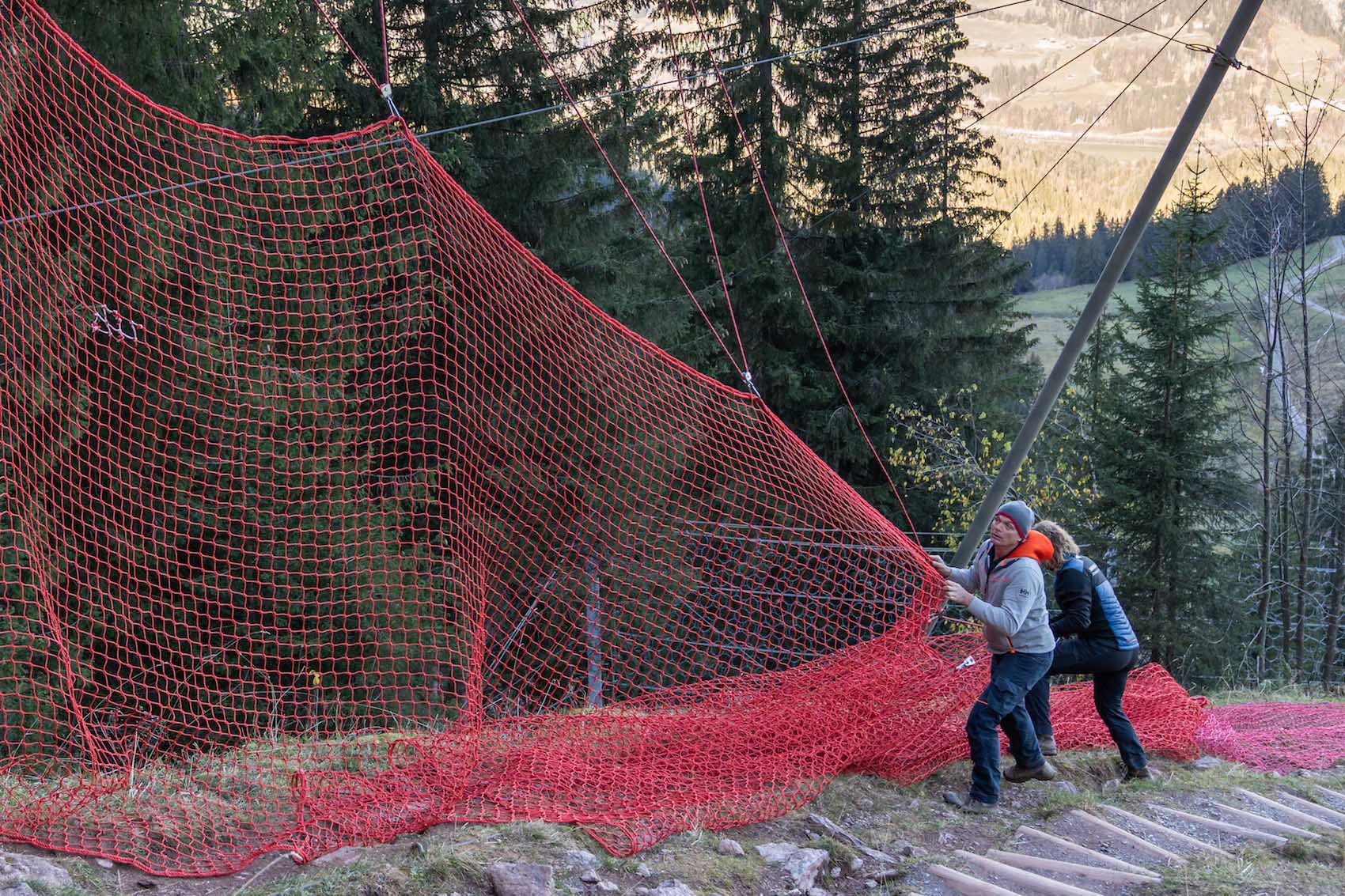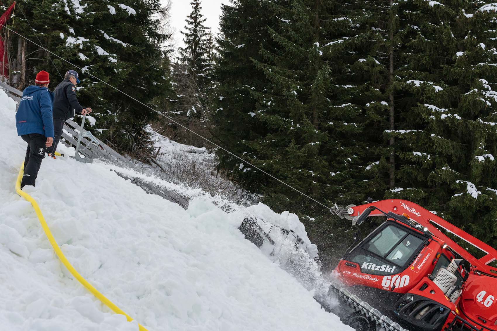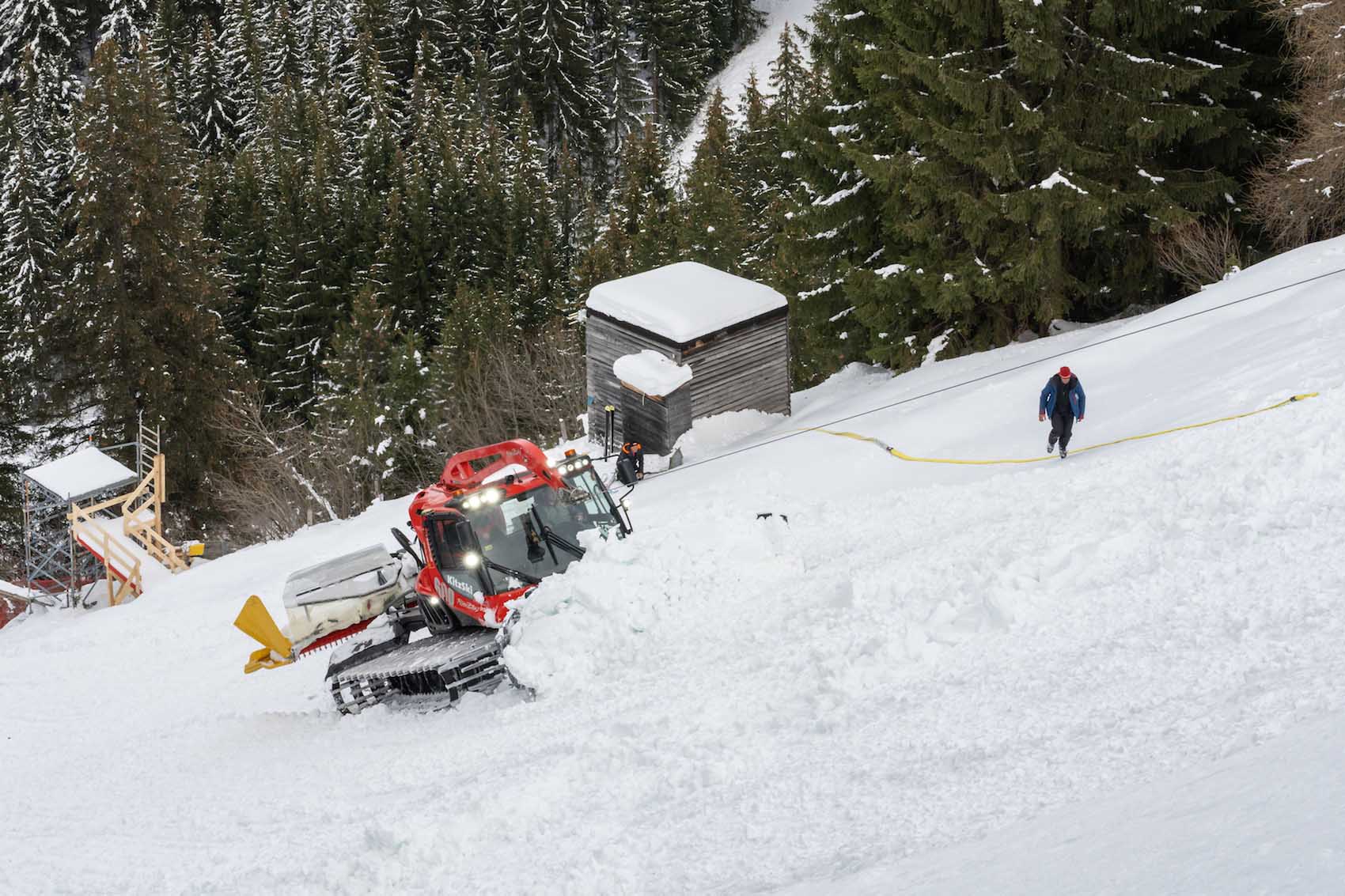 Der aktuelle Schneemangel sorgt auch im Zielgelände heuer dafür, dass einiges in der Logistik anders ist. Normalerweise starten hier nicht nur die Helicopter für den Materialtransport an die Piste, sondern vor allem auch die Pistenraupen. Doch heuer ist so wenig Schnee, dass die Pistenraupen den während der Nicht-Wintersaison hier befindlichen Golfplatz umackern würden. Dann gäbe es künftig statt der "Rasmusleiten" eine Rasmus-Lettn und das will hier keiner. Also braucht es heuer mehr an Fluggerät sowie erstmals auch einen Baukran.
