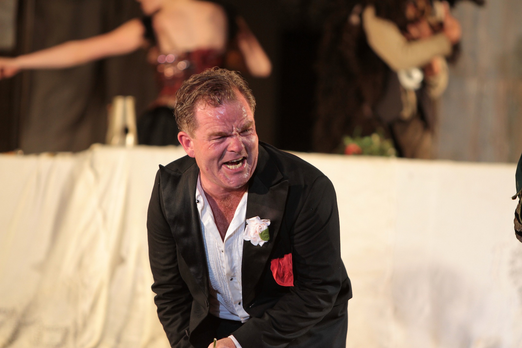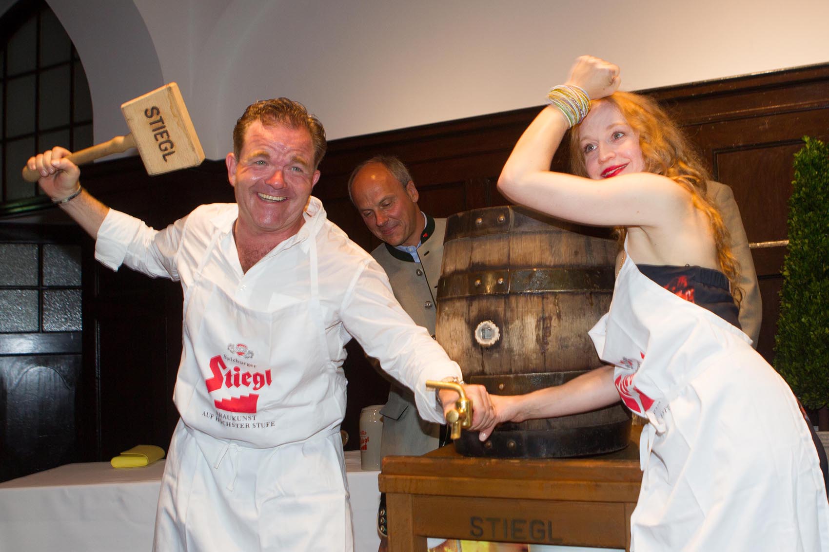 Die Mystik setzte sich auch bei der Premierenfeier fort. Denn der mitternächtliche Blick vom Stieglkeller auf den Salzburger Dom geht unter die Haut. Mit anfeuernden Zurufen bewältigten Jedermann Cornelius Obonya und „seine“ Buhlschaft Brigitte Hobmeier den Fassanstich ziemlich locker. Nach drei gekonnten Schlägen spritzte das Salzburger Bier und die Krüge konnten gefüllt werden. Moralische Unterstützung erhielten sie dabei von Chefbraumeister Christian Pöpperl und Stieglkeller-Wirt Josef Gassner. Kredenzt wurden heimische Schmankerln wie Krustenbratl mit Serviettenknödel, Eierschwammerlpasta, eine österreichische Käseauswahl, Kaiserschmarrn mit Zwetschgenröster.