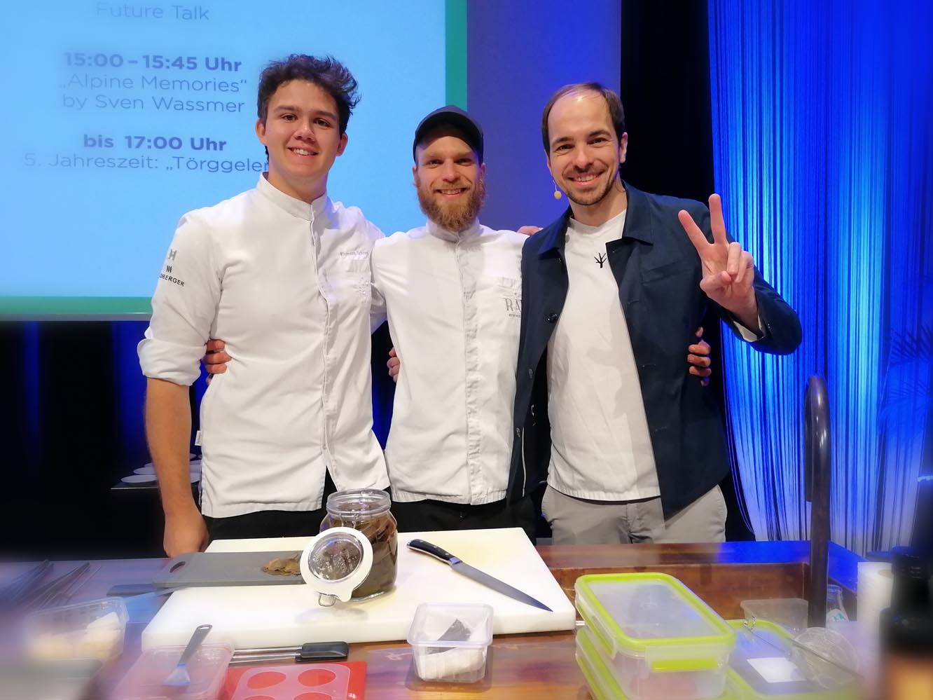Mit dabei auch der Schweizer Drei-Sterne-Koch Sven Wassmer (Restaurant Memories, Bad Ragaz / CH), der live auf der Bühne seine „Moderne Alpenküche“ präsentierte und die Gäste mit seinen Signature-Gerichten – Saibling mit karamellisiertem Rahm und Tannenöl sowie die legendären Knöpfli mit gerösteter Hefe und Trüffel - zum Schwärmen brachte.