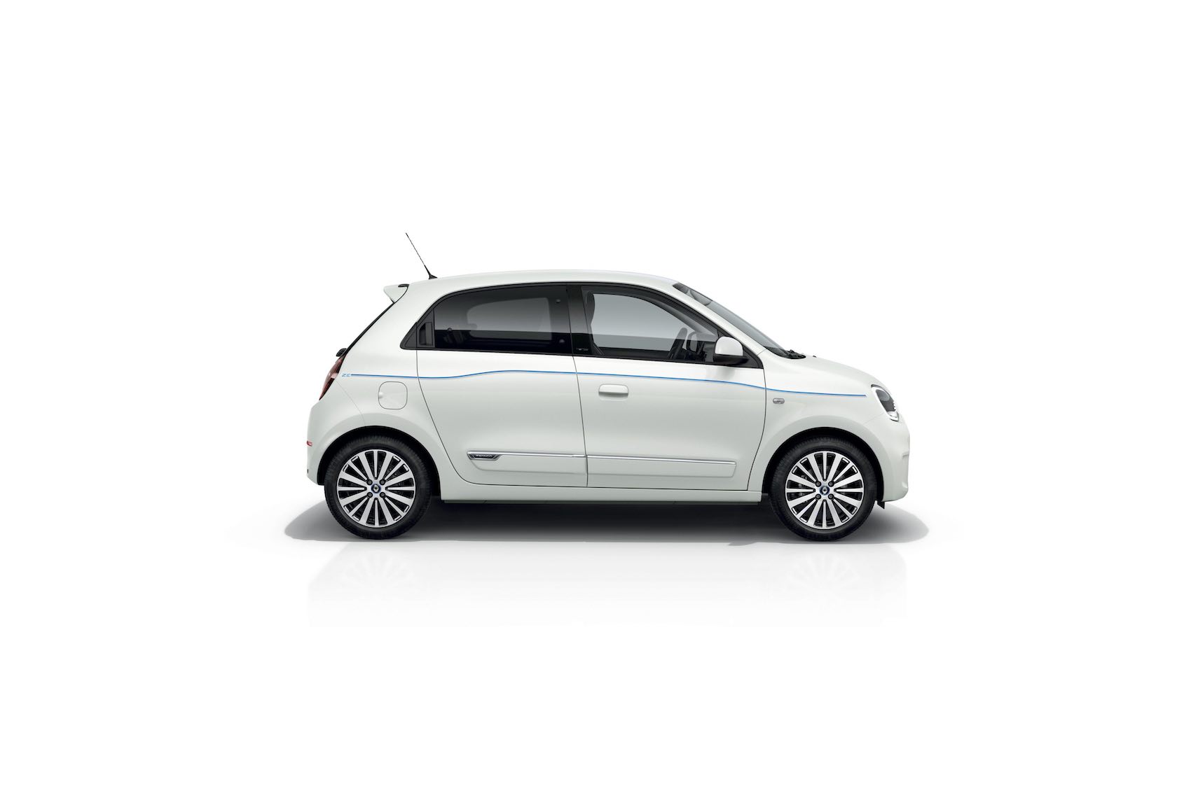 Äußerlich ist der Twingo Z.E. je nach Ausstattung unter anderem an blauen Zierelementen an den Radnabenabdeckungen oder Felgen zu erkennen. Hinzu kommen blaue Stripings an den Fahrzeugflanken, welche die Konturen der Schulterlinie betonen. Auch an den Spangen des Kühlergrills findet sich das typische blaue Dekor.