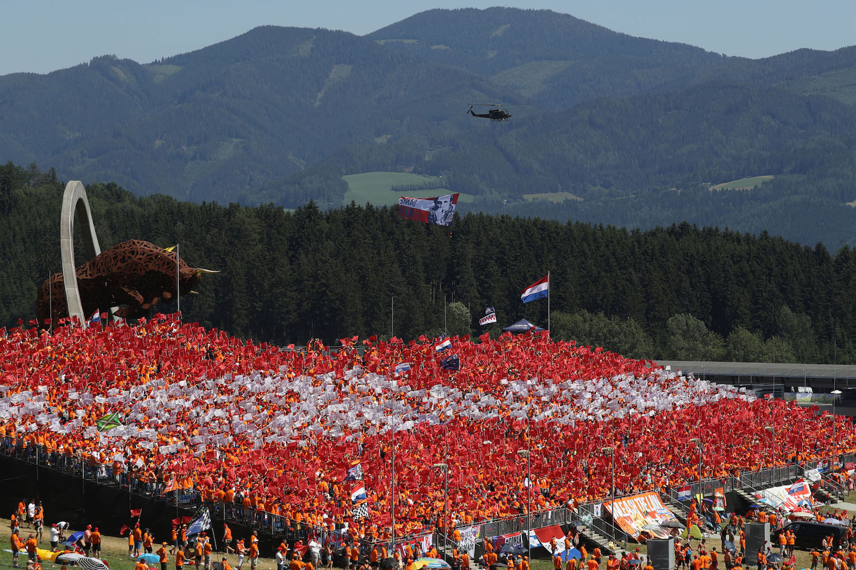 Traditionell beim „Styrian Green Carpet“ wärmten sich die Fans vor dem Welcome Center des Red Bull Ring auf für den GP-Sonntag auf. Gemeinsame Fotos mit Stars der Formel 1 und Autogramme waren heiß begehrt, viele Wünsche wurden erfüllt und Träume wurden wahr! Als Stammgäste des „Holiday Grand Prix“ durften natürlich die Flying Bulls nicht fehlen, die wieder ein beeindruckendes Air Display in den steirischen Himmel zauberten. Während die österreichische Nationalflagge und die steirische Landesfahne über der rot-weiß-roten F1-Arena einschwebten, wurden die Zuschauer Augen- und Ohrenzeugen einer Gänsehaut-Inszenierung, die ihresgleichen sucht. Direkt auf der Start-Ziel-Geraden verschmolzen das „Dachsteinlied“ und „Land der Berge“ bei einer Premiere zum unvergleichlichen Klangerlebnis. Mastermind hinter der Neukomposition im Stil von Red Bull Symphonic ist Christian Kolonovits. Die Stimmen von Christopher Seiler, Juliette Khalil und zehntausender Fans wurden getragen von einem instrumentalen Ereignis der Grazer Philharmoniker und des Kammerchors des Johann-Joseph-Fux Konservatoriums Graz.