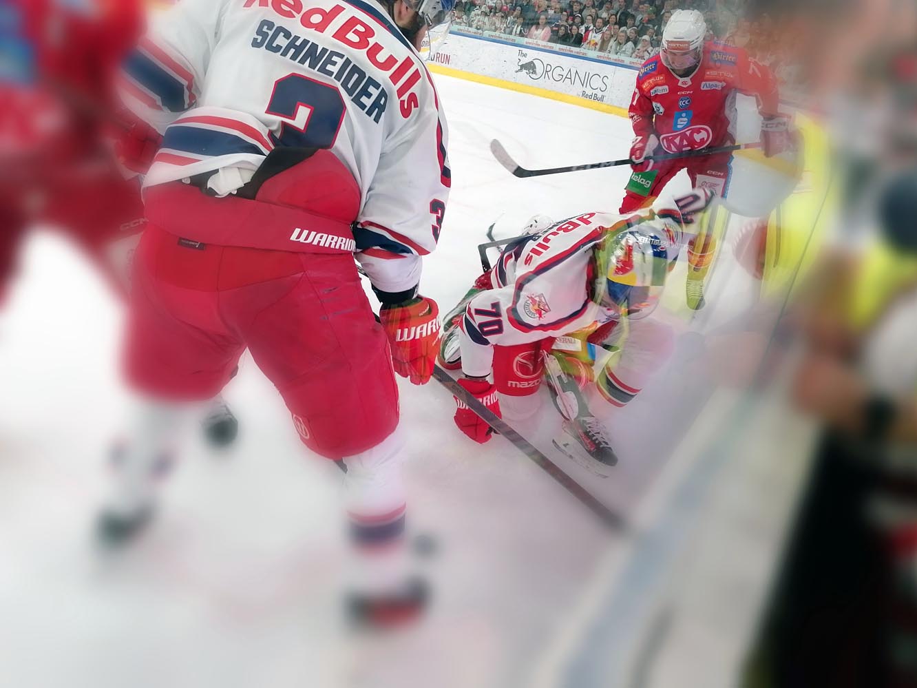Im zweiten Abschnitt waren genau 45 Sekunden gespielt, da kam Tyler Lewington plötzlich allein vorm Tor an die Scheibe und netzte trocken ein (21.). Im Nachgang hatten die Hausherren noch weitere dicke Chancen. Aber die Partie wurde wieder zu einem Auf und Ab mit wechselnden Möglichkeiten. Atte Tolvanen war bei einem 2 auf 1-Konter auf dem Posten (26.). Beide Teams drückten aufs Tempo, neutralisierten sich aber zumeist gegenseitig. Und wieder hatte der KAC zum Drittelende hin die besseren Szenen, schoss zwei, dreimal höchst gefährlich aus der Distanz. Aber die Red Bulls trafen wieder eiskalt. Lucas Thaler erkämpfte die Scheibe vor dem Tor und schob selbige dem Goalie durch die Schoner ins Netz – 3:0. Das war auch der Pausenstand nach 40 Minuten.